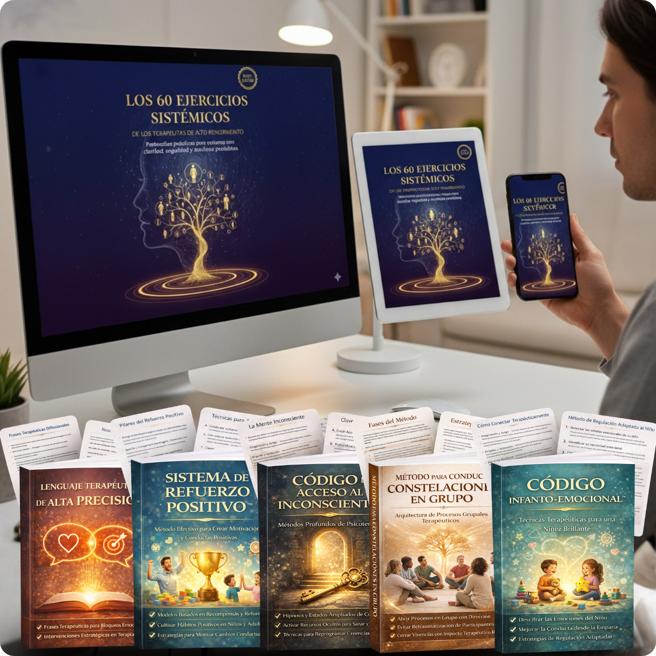 El libro “60 Ejercicios Sistémicos” es un manual clínico completo con acceso inmediato, que te entrega la estructura exacta para aplicar en tus sesiones.